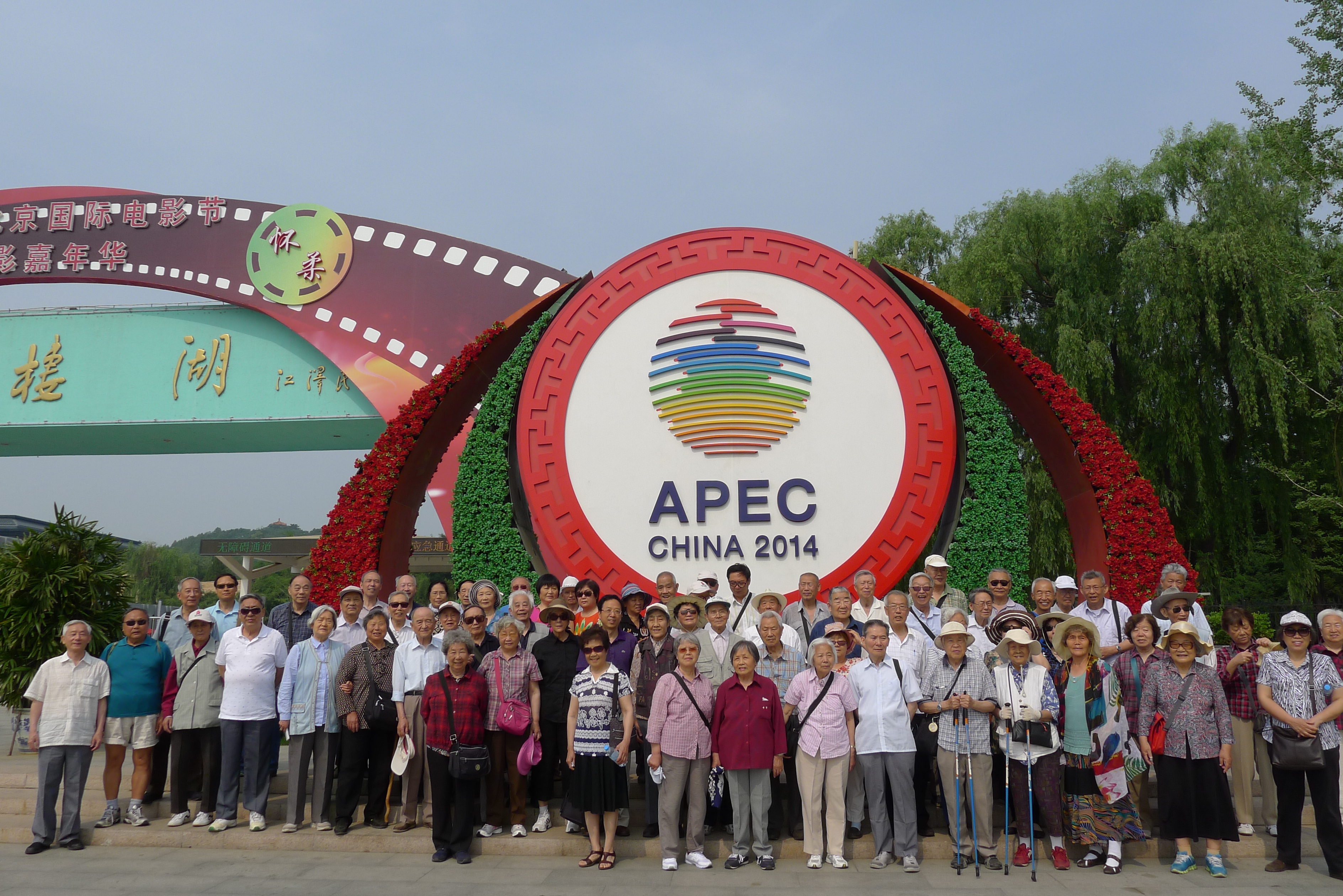 2014年亚太经合组织(APEC)第22次领导人非正式会议在雁栖湖举行,沿路经过日出东方大酒店,远观像一个竖立的鸡蛋,由于我们老师们大多年岁已高,出于安全考虑,没有组织游船绕核心岛游览,只能在湖边远眺核心岛建筑群。