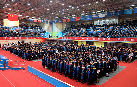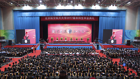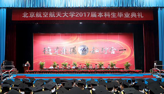 2017届本科生毕业典礼在北航体育馆隆重举行。校领导张军、徐惠彬、魏志敏、何新洲、程基伟、陶智、房建成、黄海军、李军锋、王云鹏,教师代表、电子信息工程学院刘建伟教授,空军航空大学政委薛宏伟将军,校友代表、C919试验现场总指挥刘文恭先生等领导和嘉宾与来自27个学院的3911名全日制本科毕业生和96名本科留学生,以及400余位学生家长欢聚一堂,共同见证2017届本科毕业生的美好时刻。