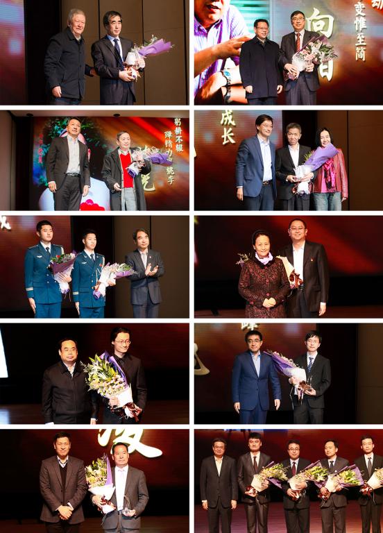 典礼进入颁奖环节, 本届10位“感动北航”获奖人物和团队一一揭晓。他们那温暖而震撼心灵的故事依次以记录短片的形式展现在观众面前,在场师生共同分享了他们精神的坚守、梦想的追寻、奉献的收获。他们是——“只道寻常 无声处听凯歌”——在高温结构材料的研制领域默默耕耘,填补了我国在叶片热障涂层技术领域的空白的宫声凯教授;“探奥传动,融万变惟至简”——使我国拥有了世界领先的汽车自动变速器生产技术,为我国培育了一条自主的自动变速器产业链的徐向阳教授;“躬耕不辍,殚精力育桃李”——从事航空发动机事业五十余载,一片丹心诠释航空报国之志的陈光教授;“寒来暑往,坚守呵护成长”——从沙河校区筹建至今已有8年时间,在平凡的岗位上默默守护沙航教学运行的李光老师;“铁肩担义,恒心立 苦行成”——身披空军蓝色戎装,胸怀北航大爱精神,在全国和首都高校比赛中双双夺冠,谱写十年辉煌、十载荣光的北航国旗护卫队;“成风化人,春雨润物无声”——潜心治学、恪尽职守,助力学生党员成长,备受学生爱戴,在教学之路上不知疲倦、砥砺前行的高宁副教授;“一心为民,爱如渊德树人”——可靠性试验领域的知名专家,潜心治学数十载,久卧病榻仍不忘传道授业的李传日教授;“博学慎行,勇攀科研高峰”——潜心钻研,实现了中国机械工程学在《nature》上发表论文零突破的张鹏飞博士;“鹰击苍穹,逐梦万丈长空”——带着火热的飞行梦,突破重重阻碍,为我国航空试飞领域做出杰出贡献的试飞英雄徐勇凌校友;“小城大学,共谱脱贫新篇”——来自五湖四海,把定点扶贫的论文写到吕梁大地上的中阳精准扶贫团队。