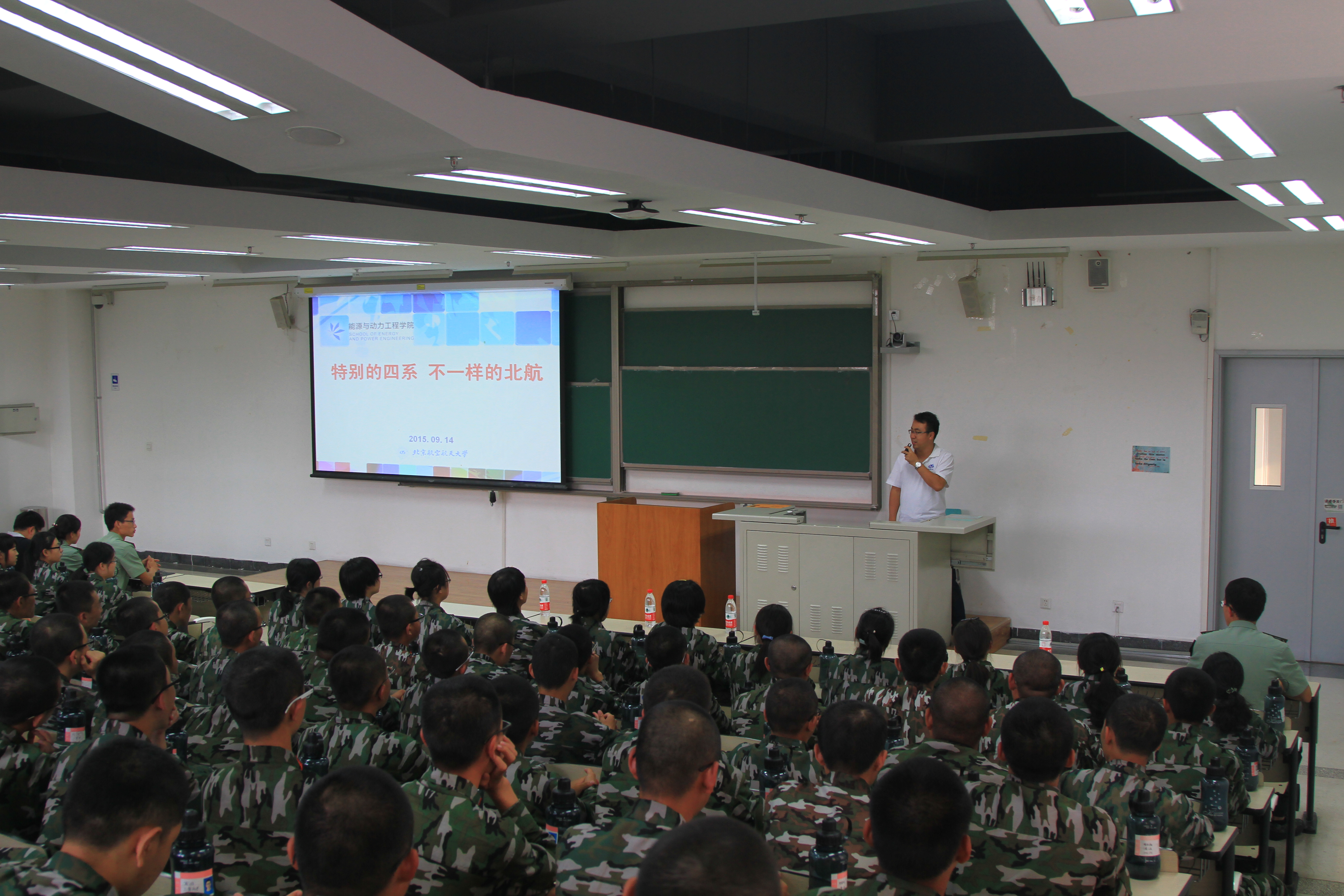 一代代老前辈为了祖国的航空动力事业鞠躬尽瘁,同学们应该继承这种精神,从进入学院之日起就心怀报国之志,努力学习,提高能力,为我国未来的航发事业添砖加瓦;《敢问路在何方》代表着同学们从祖国各地来到北航,心怀不同的梦想,但同时也要把握好大学四年时间,努力学习,找到适合自己的发展道路;第三首歌是《奉献》,没有一代代四系人的艰苦付出,北航四系不可能有今天,同样地,如果没有我们这一代四系人的努力,北航四系,乃至我国的航空发动机事业都不可能有明天。最后,书记提到著名电视剧《亮剑》,希望我们的同学们在今后的学习生活中能时时处处发挥“亮剑精神”,对自己严格要求,争先创优,用实际行动唱响“北航四系,王牌动力”的口号。