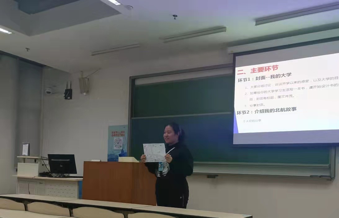 首先,班主任周重文老师通过亲切的交谈了解同学们开学之后的学习状态,通过自身经历和丰富的教学经验解答了同学们近期遇到的问题。接着,老师鼓励同学们以水彩画的形式描述开学一个多月以来的北航新生活,展现自己对北航未来生活的憧憬,以“我的大学生活”为主题绘制一本书的封面。同学们结合自身情况绘制封面,上前展示自己的绘画作品并解释其中蕴含的含义。同学们以画笔传递心声,以文字抒发感情,用手中的画笔表达出自己对北航的生活的独特感受。