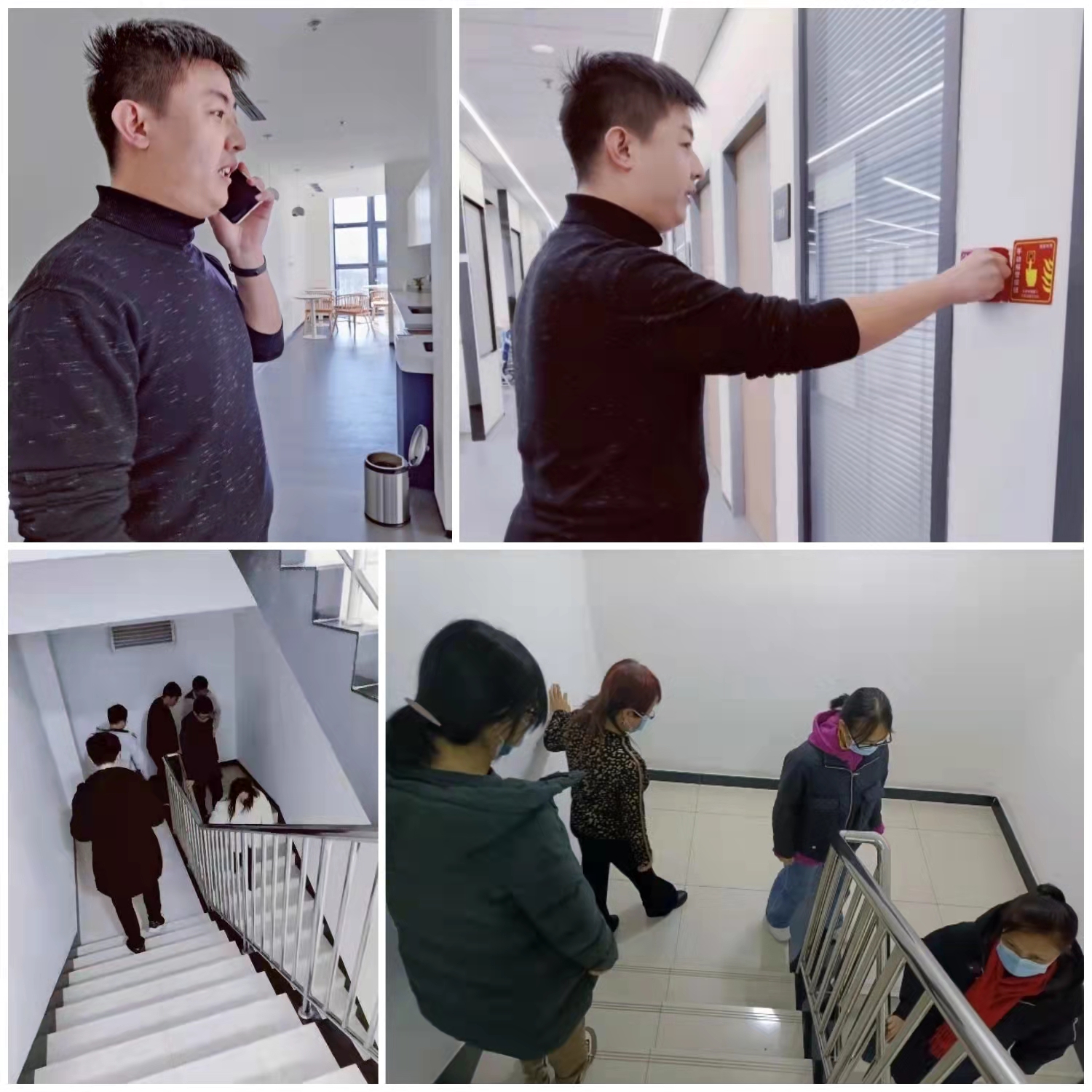 带着新学习的消防安全知识,下午3:45分,100余位师生开展了消防安全应急演练。首先,一名同学“发现”F座8层西侧楼梯间的模拟火情,第一时间向学院消防安全领导小组报告,拨打沙河校区火灾报警电话,并通过手动报警装置报警。学院消防安全领导小组立刻将火情通报全体师生,并根据《消防安全应急方案》,各层安全负责人组织参加演练的100余位师生从安全路线有序撤离。接到报警后,校消防站队员迅速赶到现场并扑灭火灾。