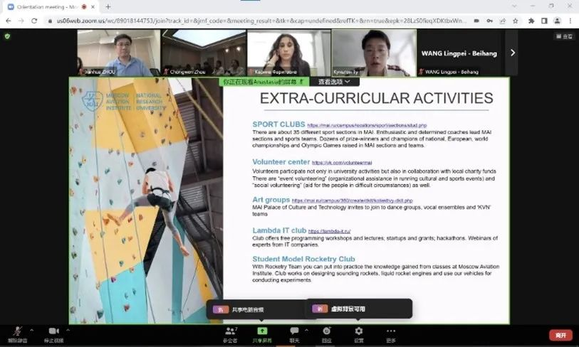 会上,莫斯科航空学院国际部Anastasia女士向同学们介绍了莫斯科航空学院的发展历史和现状,Kalina女士向同学们介绍了“航空发动机”专业的人才培养体系、课程设置以及关于课程考核方式等方面的详细信息,并邀请目前在莫航就读的中国留学生陆鲲鹏,向同学们传授了赴俄留学和生活的经验。同学们就自己关心的学习、住宿、交通等各方面的问题进行了提问,莫航方面一一作答,并表示愿意尽最大努力,帮助同学们顺利完成在俄期间的学习任务。