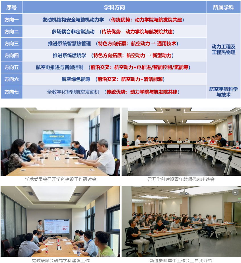 学院坚持把学科建设作为发展根基,召开学术委员会、青年教师代表座谈会,教师代表大会、党政联席会等,经过反复研讨和全面梳理,系统谋划和凝练7个学科新方向,既巩固传统优势,更突出前沿交叉,为传统学科注入新动能。围绕学科新方向搭平台、引人才、聚团队,成立国内首个电推进系(航空),做实航空电推进和智能控制新方向。聘任一级学科和学科方向带头人,引进环境学科12位教师并交叉融入各方向。
