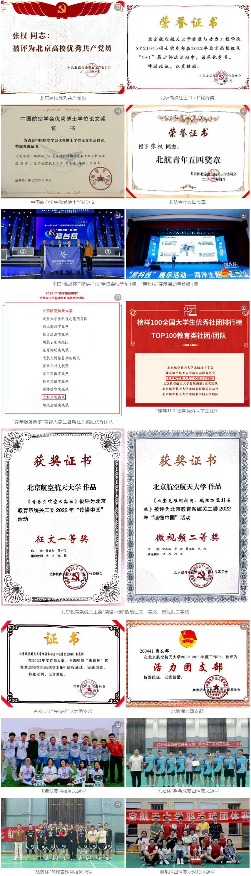 动力学子在2023年奋发有为,获得校内外多项荣誉。博士生张权获北京高校优秀共产党员、北航青年五四奖章,刘长奇获中国航空学会优秀博士学位论文奖(全国10人),倪书之获得北京市优秀本科生毕业设计(论文),谭正红获北航励志成长成才表率,刘鑫获北航十佳志愿者,张权、杨璐瑜获北航优秀学生半脱产干部奖学金最高奖。获全国“挑战杯”“揭榜挂帅”专项赛特等奖1项,“黑科技”展示活动星系级(全国第一)1项,全国大学生节能减排社会实践与科技竞赛二等奖1项、三等奖1项,并支持北航获优秀组织奖。获北京教育系统关工委“读懂中国”一等奖1项。“心起点”实践队获“青年服务国家”首都大学生暑期社会实践优秀团队、“榜样100”全国优秀大学生社团。SY21045支部获北京高校红色“1+1”优秀奖,200441班获北京市先进班集体、“先锋杯”活力团支部、北航十佳班集体、活力团支部、标兵团支部。SY22043班获北航先进班集体。学院获飞盘联赛两校区总冠军2次,“风云杯”乒乓球赛团体赛总冠军、“航篮杯”沙河校区冠军、羽毛球团体赛沙河校区冠军。
