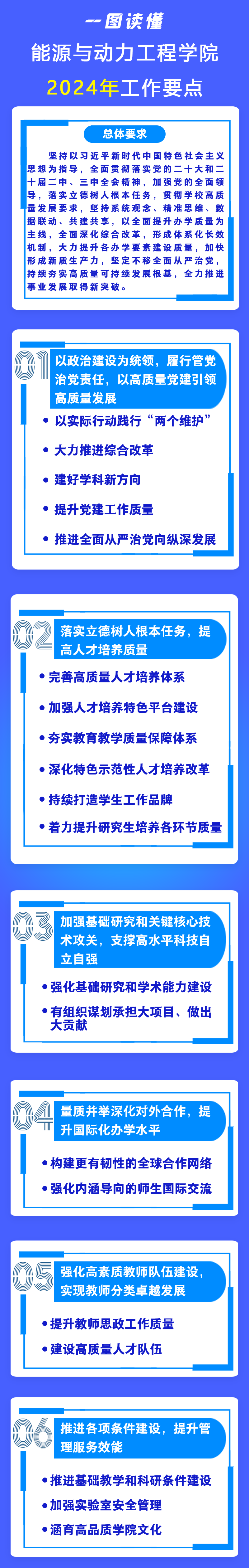 一是以政治建设为统领,履行管党治党责任,以高质量党建引领高质量发展。以实际行动践行“两个维护”。坚持不懈用习近平新时代中国特色社会主义思想凝心聚魂,巩固拓展主题教育成果。筹备召开学院党代会,系统谋划未来发展方向和战略措施。大力推进综合改革,增强办学活力和教师发展动力。建好学科新方向,坚持学科、平台、团队一体化发展。提升党建工作质量,注重以事业高质量发展成效检验党建工作成效。推进全面从严治党向纵深发展。二是落实立德树人根本任务,提高人才培养质量。完善高质量人才培养体系,推动能源与动力工程国家级一流本科专业建设,重点打造核心课程教学团队,制定名师培育计划。加强人才培养特色平台建设。夯实教育教学质量保障体系,完善人才培养质量指标体系。深化特色示范性人才培养改革,推进吴大观班改革和本研一体化培养。深化学生工作与教学工作联动,持续打造学生工作品牌。着力提升研究生培养各环节质量。三是加强基础研究和关键核心技术攻关,支撑高水平科技自立自强。强化基础研究和学术能力建设,组织国家自然科学基金等基础科学研究项目申报,动员教师积极参与国家级人才项目申报,建立高水平论文院级奖励机制。有组织谋划承担大项目、作出大贡献。发挥氢能混合动力型号研制牵引作用,共同谋划未来发展的顶层构架和技术路线。建好学院质量管理体系。四是量质并举深化对外合作,提升国际化办学水平。构建更有韧性的全球合作网络,推进外国发动机领域专家的引智工作,深化在基础研究方面的国际合作,组织学院出访团赴国际知名学术机构访问。强化内涵导向的师生国际交流,深化与莫斯科航空学院合作,扎实推进与香港大学联合培养项目落地。恢复举办暑期学校,邀请国外专家来校开课,举办有影响力的国际会议及双边学术论坛。五是强化高素质教师队伍建设,实现教师分类卓越发展。提升教师思政工作质量,强化教职工行为规范,助力新进教师提升能力素养。建设高质量人才队伍,围绕学科新方向,制定人才引进工作方案。推进“有组织科研合作、青年教师企业实岗锻炼、卓工研究生联培”三位一体合作方案落地。加强与国内外高校和科研机构的联系,拓宽海内外人才引进渠道。六是推进各项条件建设,提升管理服务效能。加快推进基础教学和科研条件建设,与航发院联合申报新域新质重大科技创新平台。加强实验室安全管理。涵育高品质学院文化。完善党的领导、行政管理、学术治理、民主管理四位一体的制度体系。