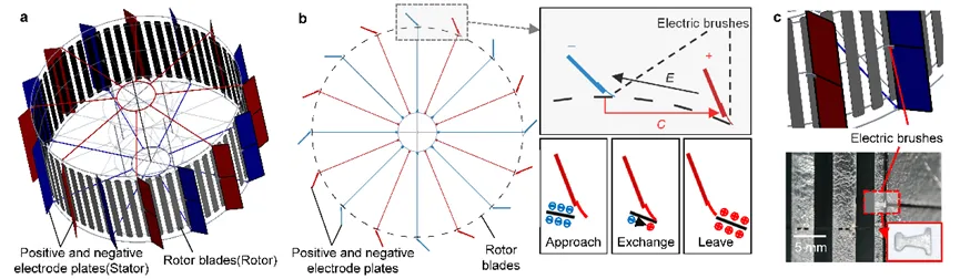 静电发动机的核心是静电电机,它是一种依靠静子和转子间的库仑力(Coulomb force)来产生连续旋转运动的新型微型电机,具备结构简单和无需绕组的优势,其高电压(千伏级)、低电流(微安级)的工作特性也使其在工作过程中发热少且无明显红外特征。相比传统电磁电机,静电电机表现出了颠覆式的效率和功耗特性,在小质量(5克以内)情况下,其能量转化效率可达传统电磁电机的10倍以上,产生相同升力所需功耗仅为电磁电机的1/10以内,因此即便采用小尺寸太阳能电池,也可以为微型飞行器提供飞行所需功率。