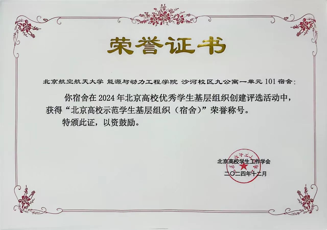 沙河校区九公寓一单元101宿舍获得北京高校示范学生基层组织(宿舍)荣誉。