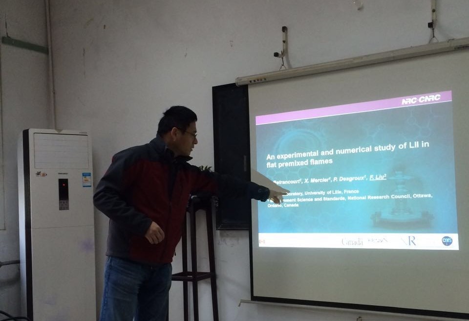 刘凤山研究员首先介绍了加拿大国家研究院的情况。在随后的报告中以烟尘的形成机理和颗粒粒径测试技术为铺垫,引出了激光诱导发光(LII)原理,并对他们开发的LII模型做了介绍。整个报告深入浅出,图文并茂。报告结束后,刘教授与参会人员进行了交流互动,大家就LII技术和火焰各层化学组分等问题向刘教授进行了咨询,都得到细致的解答。最后,报告在热烈的掌声中结束。