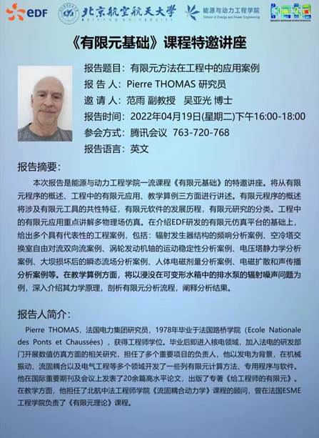一流课程《有限元基础》的特邀讲座。报告从有限元程序的概述、工程中的有限元应用、教学算例三方面进行讲述。Pierre THOMAS 研究员讲解了有限元程序的概述涉及有限元工具的共性特征,有限元软件的发展历程,有限元研究的分类等,重点讲解工程中的有限元应用多物理场仿真。在介绍EDF研发的有限元仿真平台的基础上,给出多个具有代表性的工程案例,包括:辐射发生器结构的频响分析案例、空冷塔交换室自由对流双向流案例、涡轮发动机轴的运动稳定性分析案例、电压塔静力学分析案例、大坝损坏后的瞬态流场分析案例、人体电磁剂量分析案例、电磁扩散和声传播分析案例等。在教学算例方面,Pierre THOMAS 研究员以浸没在可变形水箱中的排水泵的辐射噪声问题为例,深入介绍其力学原理,剖析有限元分析流程,阐释分析结果。师生们普遍反映Pierre THOMAS 研究员的报告通过实例分析,清晰明了,受益匪浅。