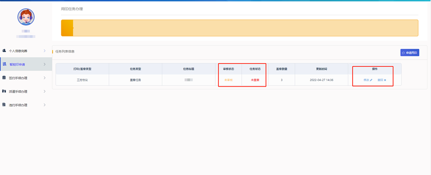 选择“用印任务”中已申请的盖章任务,点击“准备用印任务”,跳转后点击“开始任务”。