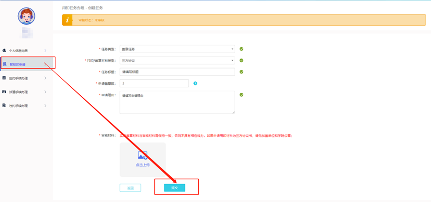 按照页面要求与申请用印的材料类型提交申请,填写完毕后点击提交。
